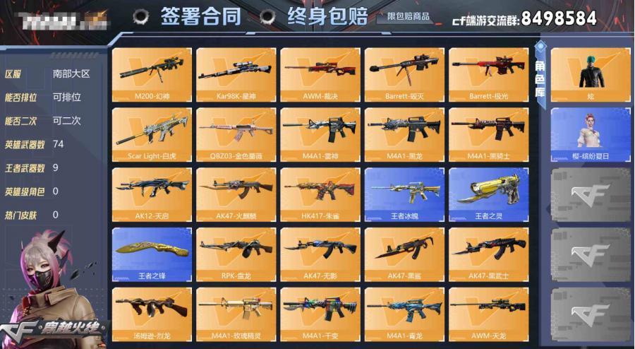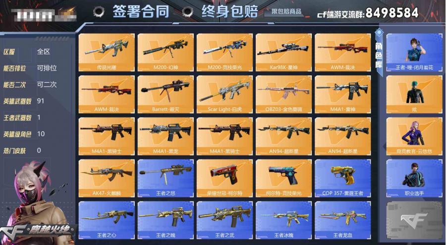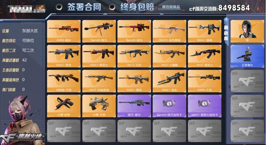 【可二次 英雄武器数量:42 英雄角色数量:0 王者武器数量:0 王者复仇 零 M4A1-黑骑士音效卡,Barrett-毁灭音效卡 天龙-传奇70KG,战神-粉色甜心 稀有武器:10个 】