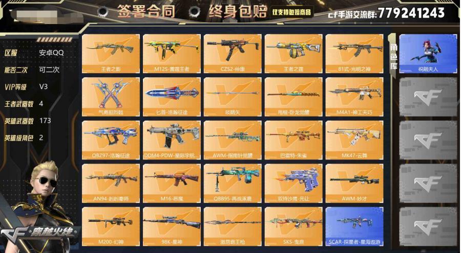 【V3王者武器V数量:4英雄武器V数量:173王者武器:M12S-雷霆王者,王者之霆,王者之影特殊武器:21个M200-幻神,CZS2-仲康,激昂霸王